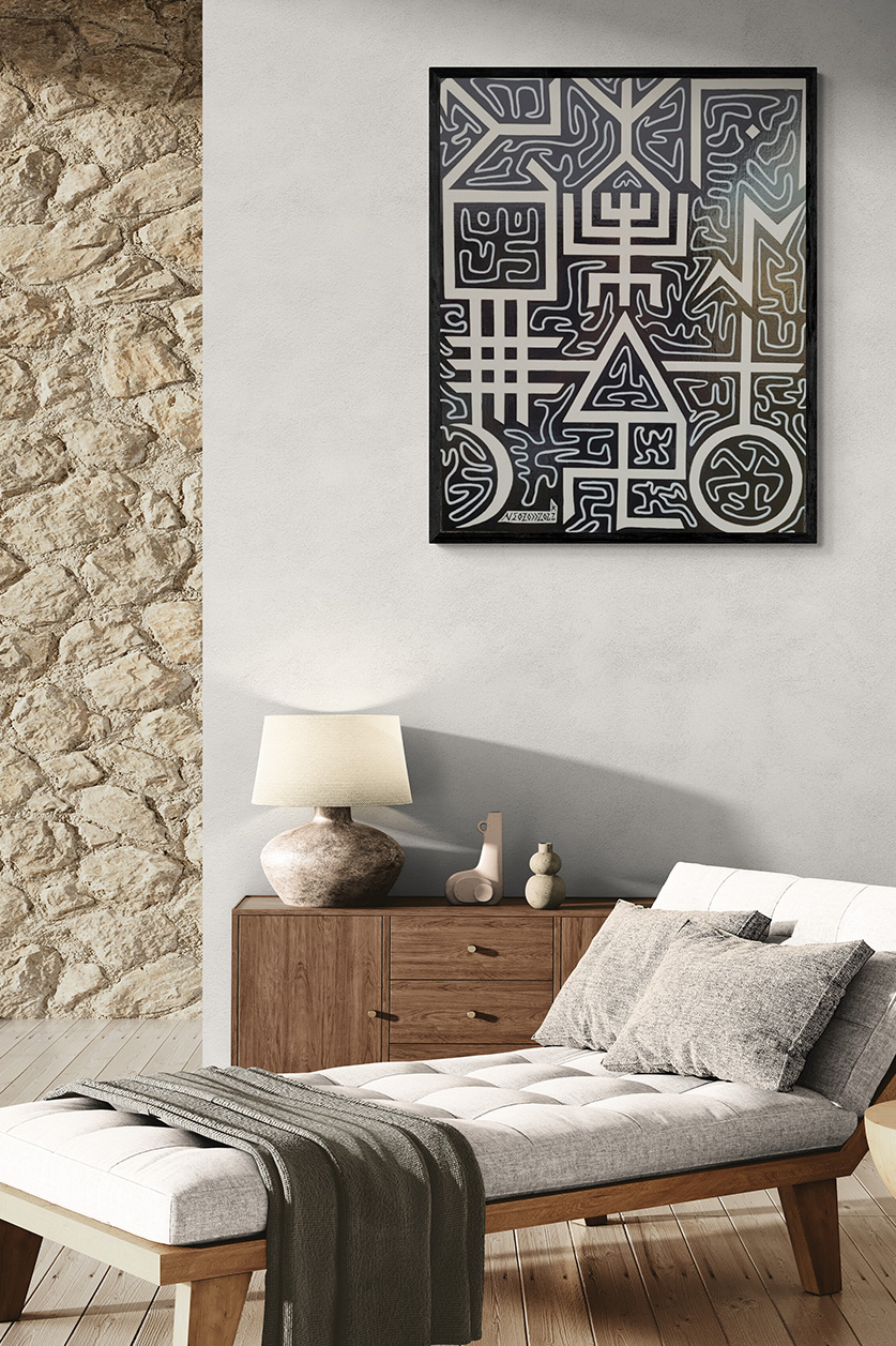 I love the perfection of the geometrical shapes and the way colors vibrate. it completely transformed my bed room, and the fact that it was a costume made painting with all my family on it, makes it more special to me and my husband.