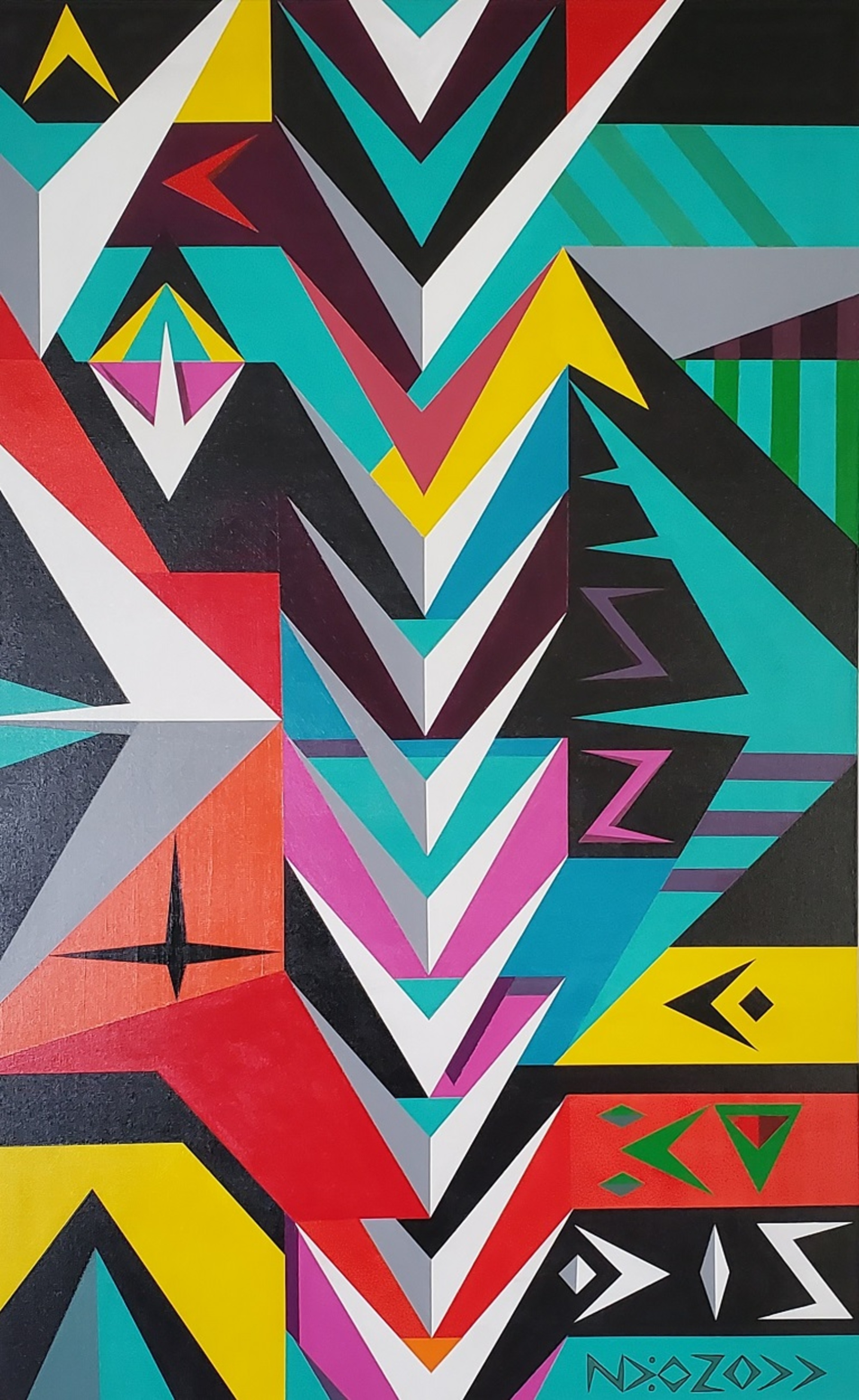 Some of the main characteristics of Neozodd is the geometry, the absence of figurative elements and the feeling of belonging to past decades. In this particular work, an unconscious influence from the 1980s is chromatically reflected in a zigzagging vertical composition.